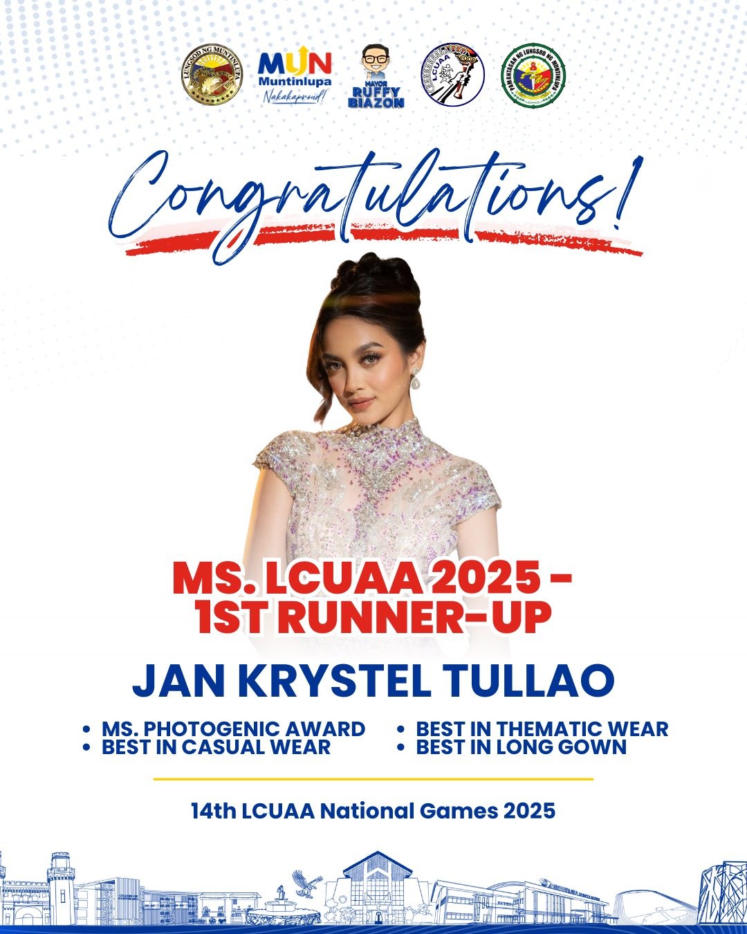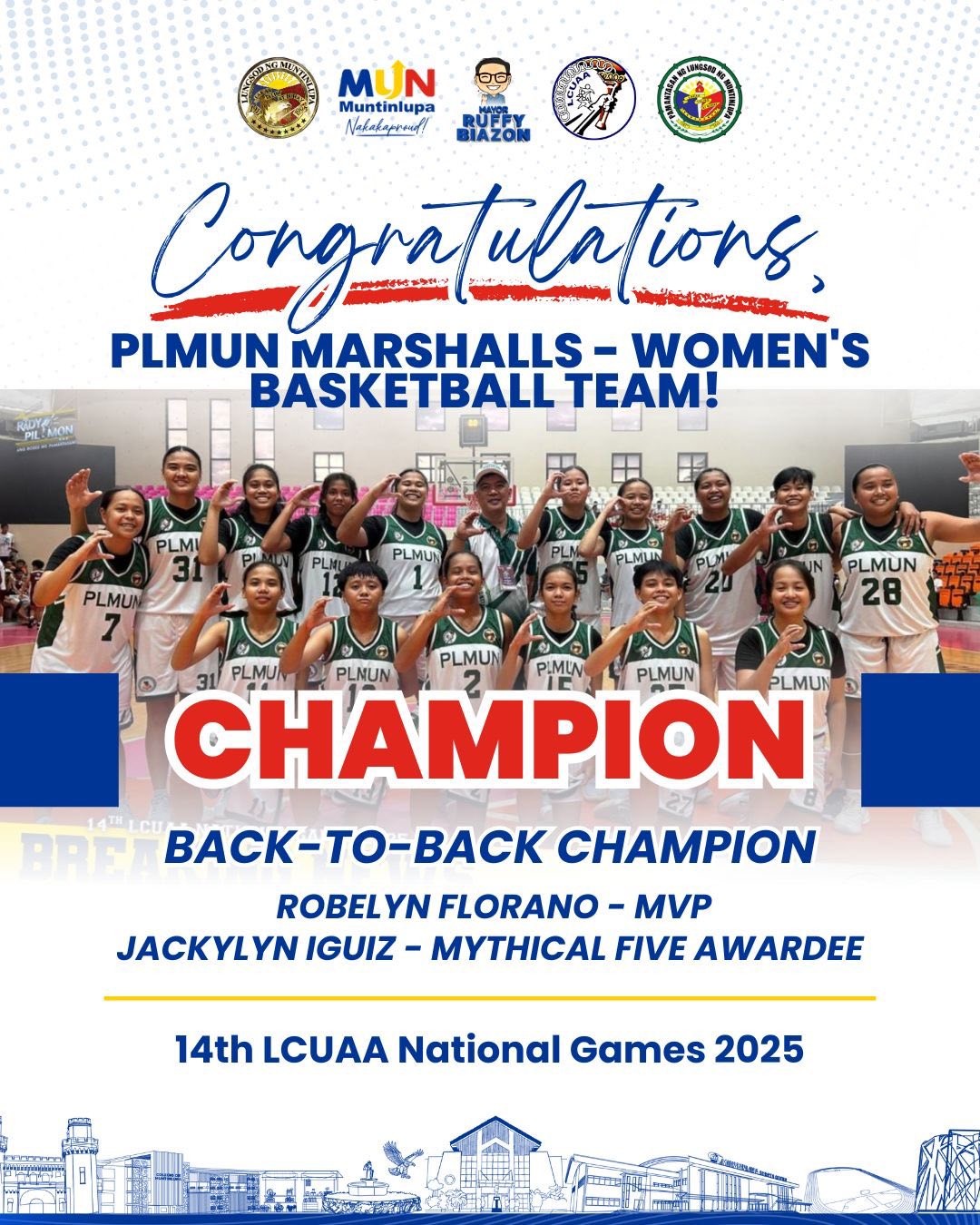 Matagumpay na nagtapos ang delegasyon ng Muntinlupa sa 14th Local Colleges and Universities Athletic Association (LCUAA) National Games 2025, na ginanap noong Oktubre 19–25, tampok ang mga kampeon at medalist mula sa Pamantasan ng Lungsod ng Muntinlupa (PLMun) at Colegio de Muntinlupa (CDM)!