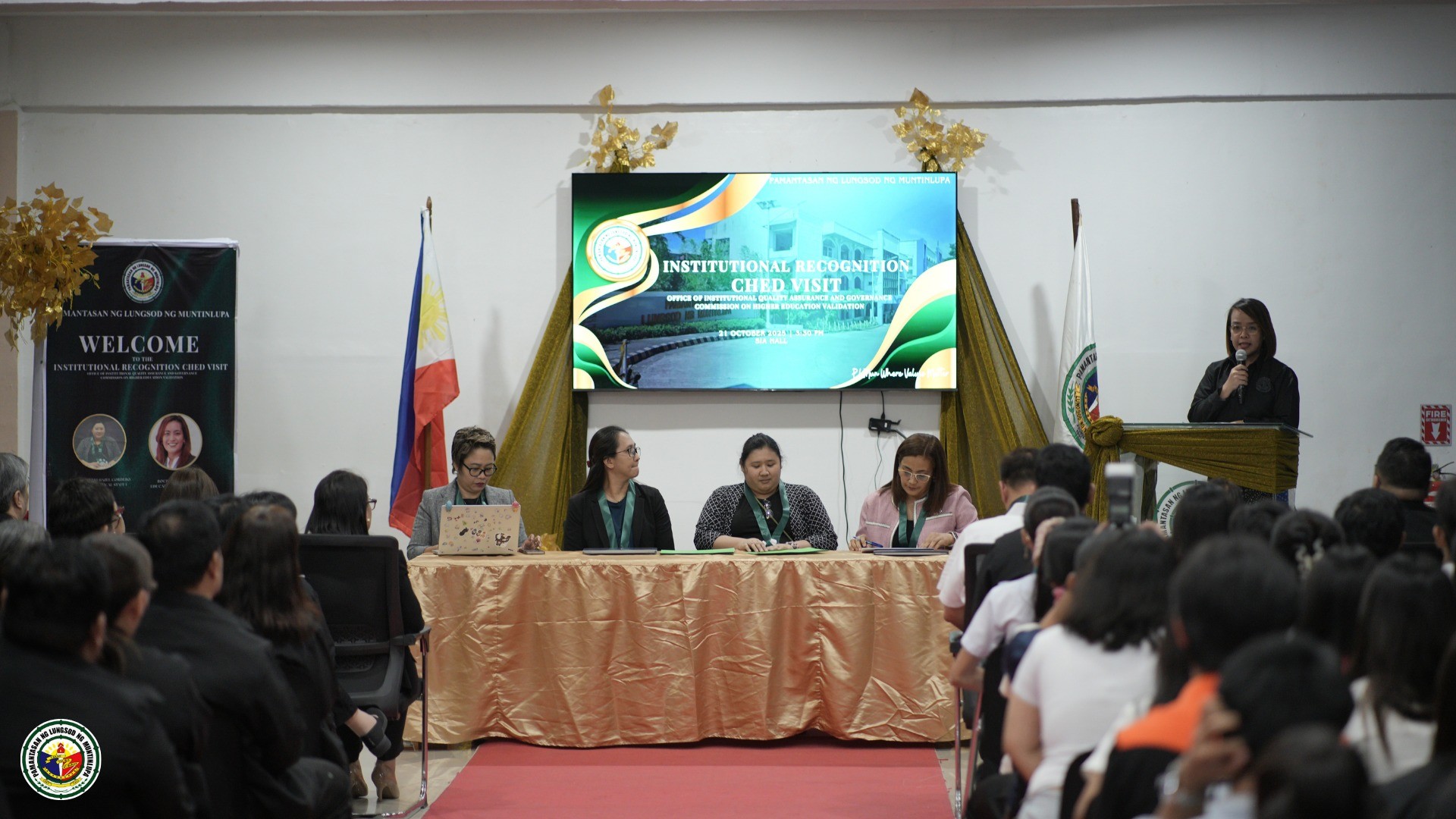 On October 21, 2025, Pamantasan ng Lungsod ng Muntinlupa (PLMun) warmly welcomed representatives from the Commission on Higher Education (CHED) for the Institutional Recognition Visit. The university was honored to receive Ms. Katherine Lei Hazel Cordero, Project Technical Staff I; Ms. Rochelle Jimenez and Ms. Maridel Negradas, both Education Supervisors II; and Ms. Rachel D. Casimero, Chief Education Program Specialist.