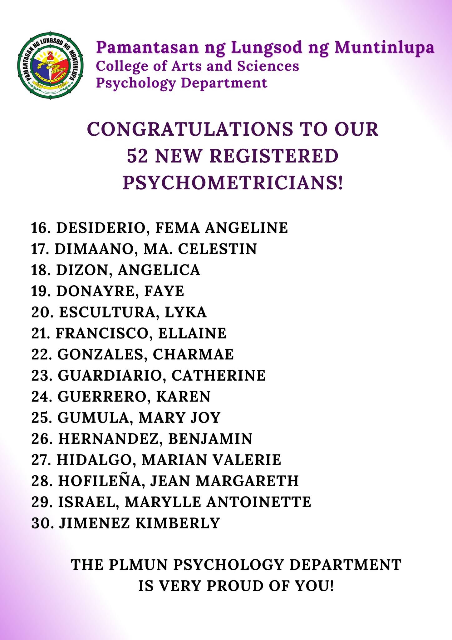 We proudly celebrate the 52 new Registered Psychometricians from Pamantasan ng Lungsod ng Muntinlupa!