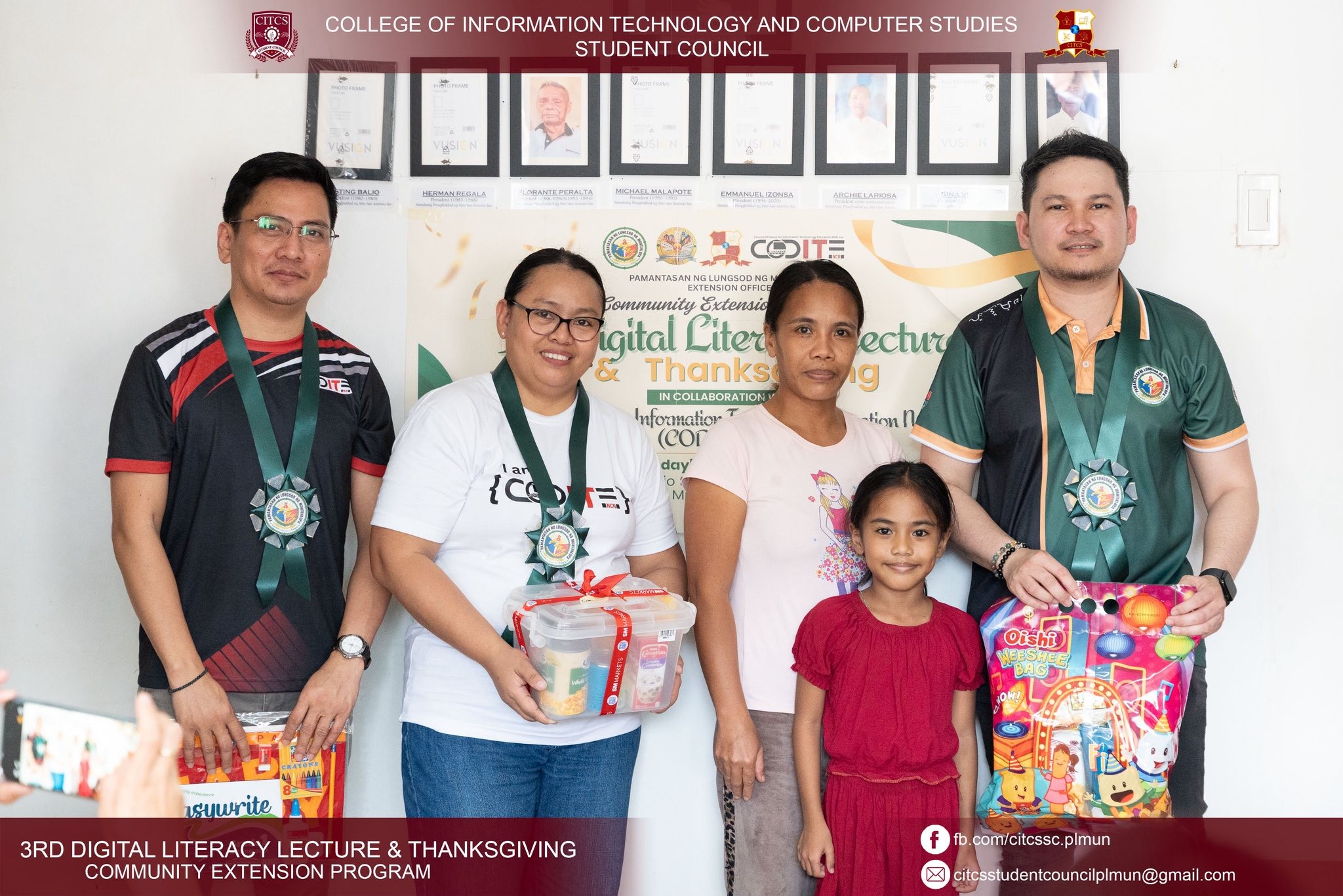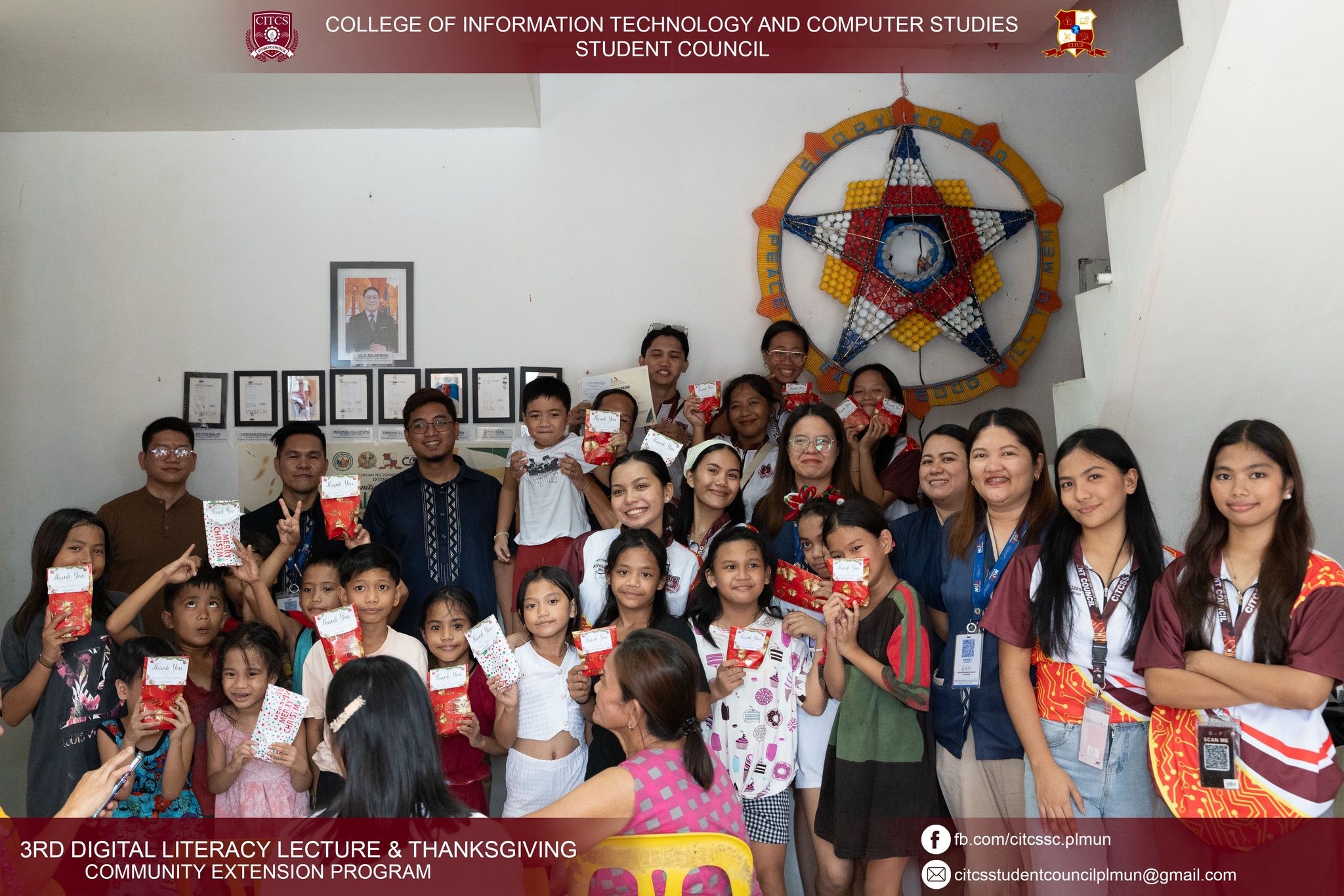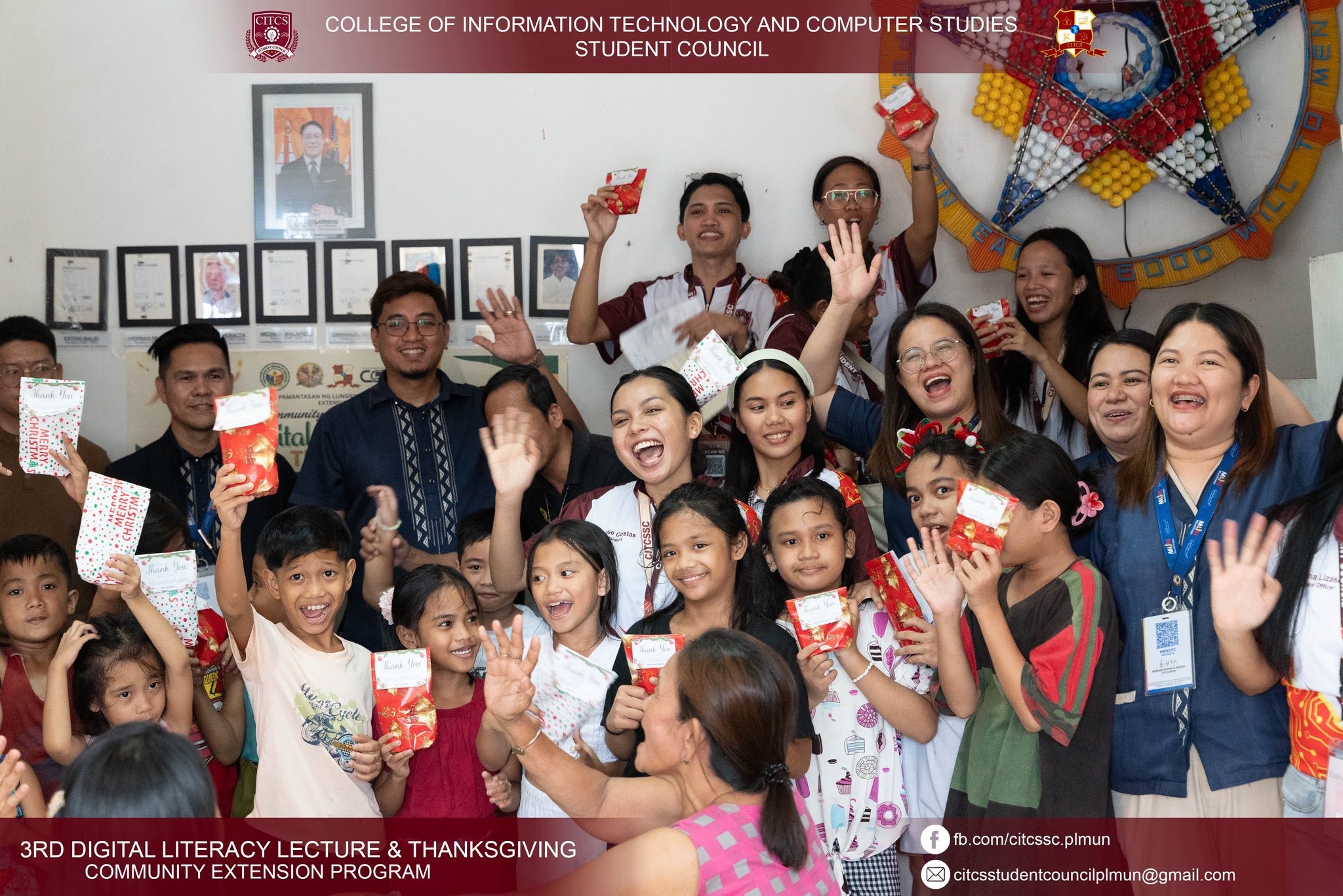 The PLMUN – Extension Office, together with the CITCS Faculty, the CITCS Student Council, and in collaboration with the Council of Deans for IT Education – NCR (CODITE-NCR), successfully conducted the 3rd Digital Literacy Lecture with Thanksgiving and Gift-Giving Program.