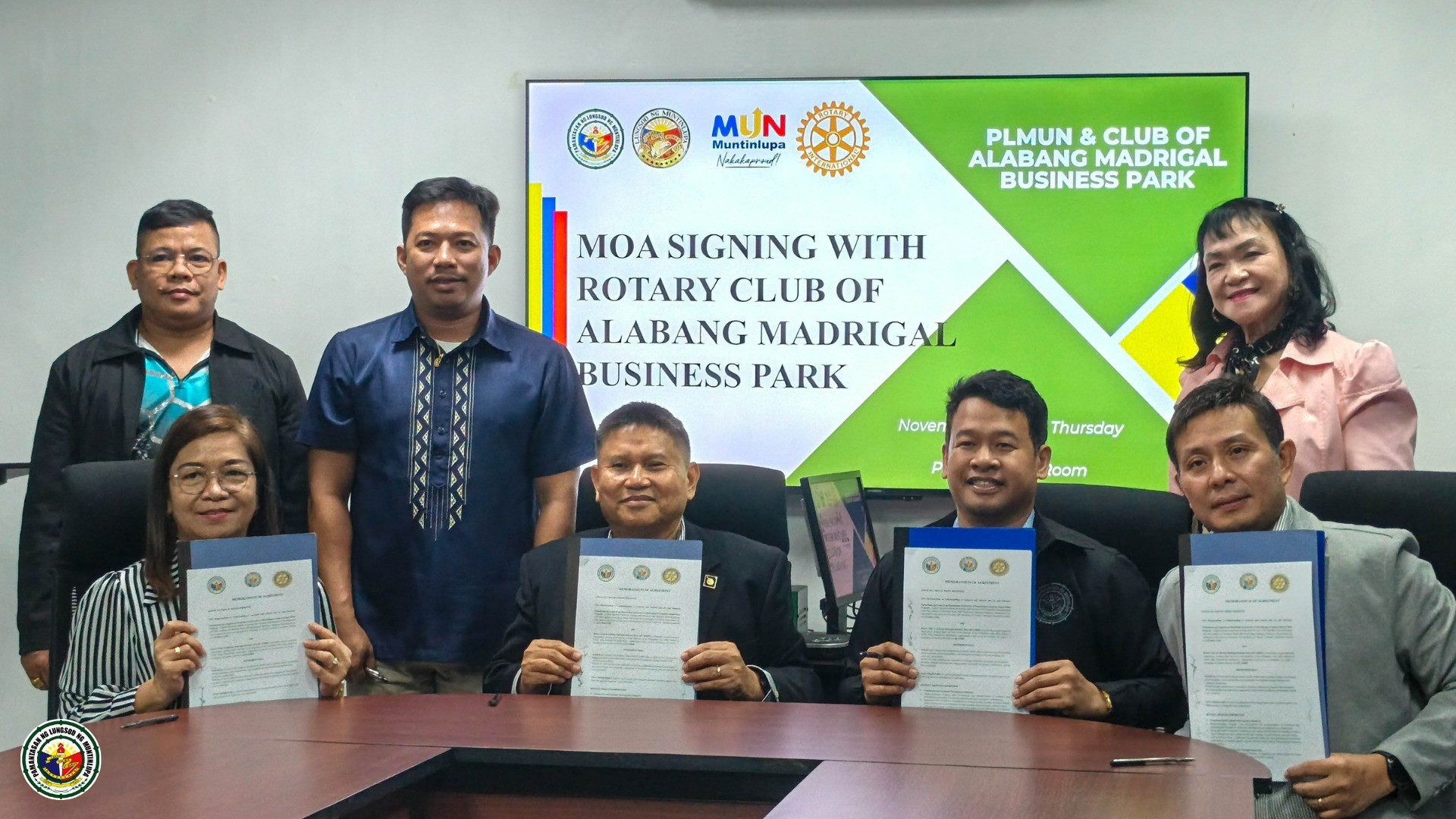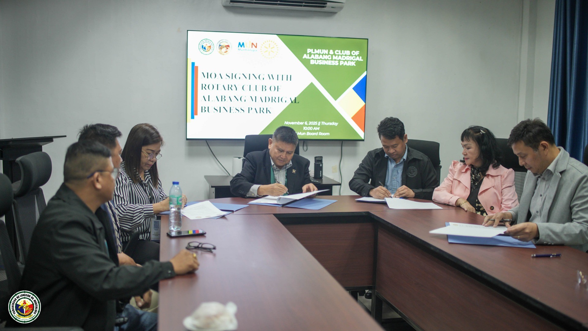 On this day, November 6, a Memorandum of Agreement (MOA) was formally signed between the Pamantasan ng Lungsod ng Muntinlupa (PLMun) and the Rotary Club of Alabang Madrigal Business Park. This partnership was made possible through the initiatives of the Graduate Studies Office, led by Dean Remedios R. Cunanan and Dr. Cecil Ediza, MBA Program Director, and in collaboration with the Center for Linkages and International Affairs (CLIA), Dir. Sherwin C. Esteron under the Office of the Vice President for Research, Extension, Quality Assurance, Linkages, and International Affairs (OVP-REQALIA).