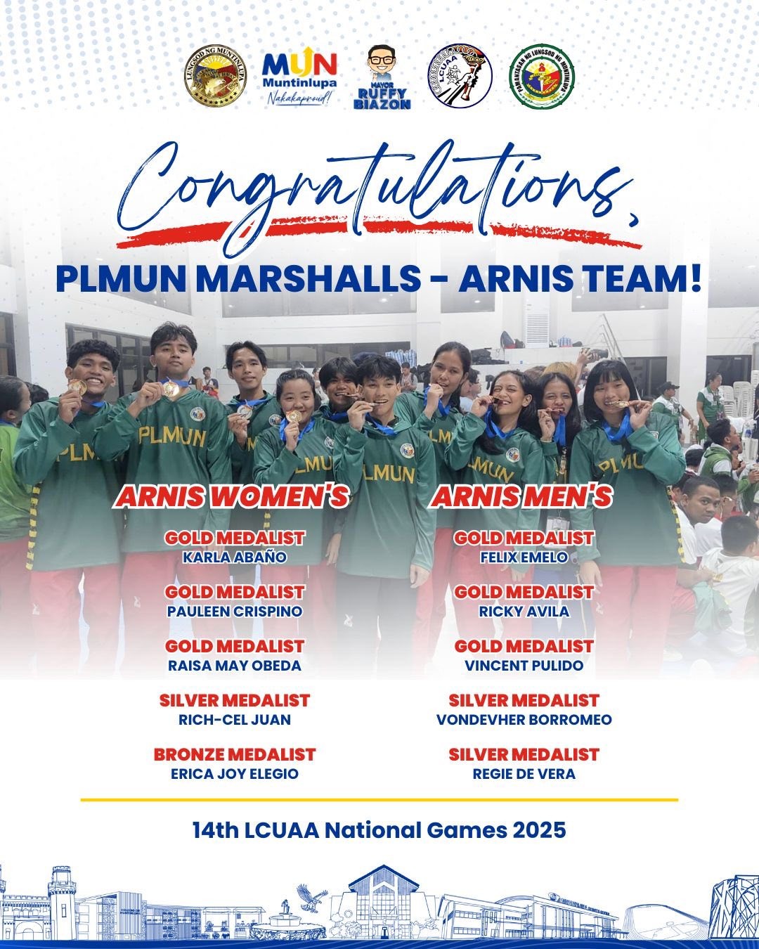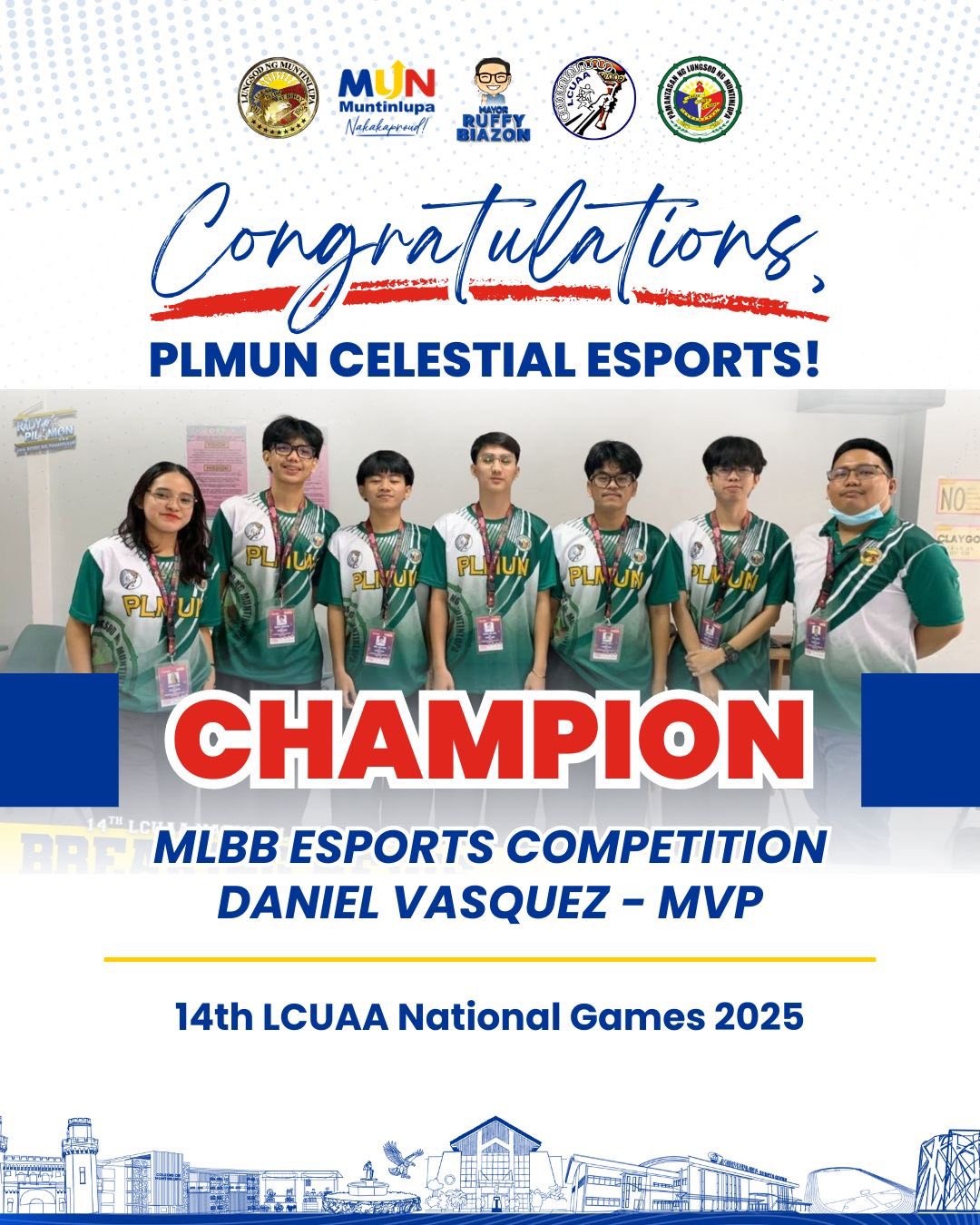 Matagumpay na nagtapos ang delegasyon ng Muntinlupa sa 14th Local Colleges and Universities Athletic Association (LCUAA) National Games 2025, na ginanap noong Oktubre 19–25, tampok ang mga kampeon at medalist mula sa Pamantasan ng Lungsod ng Muntinlupa (PLMun) at Colegio de Muntinlupa (CDM)!