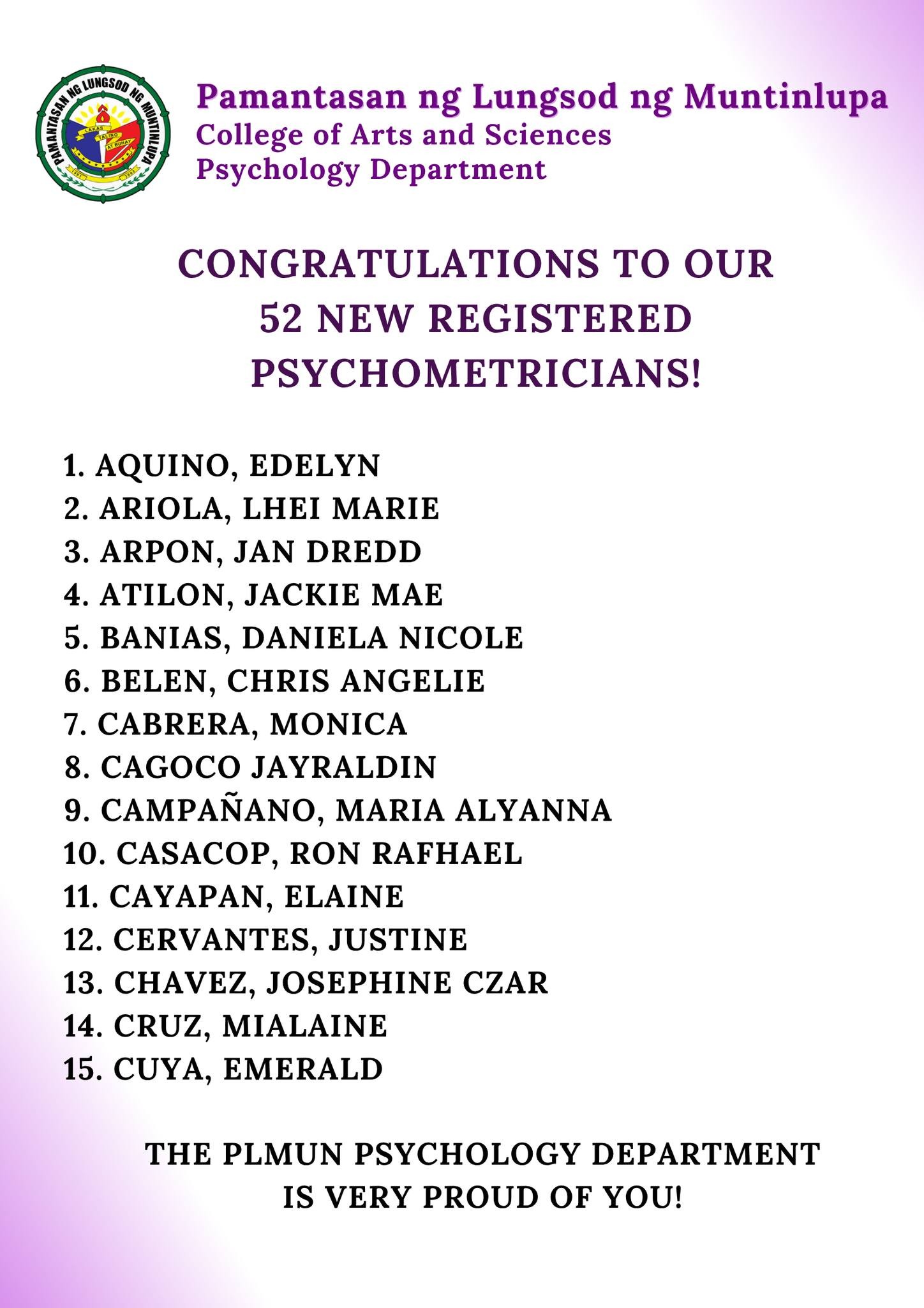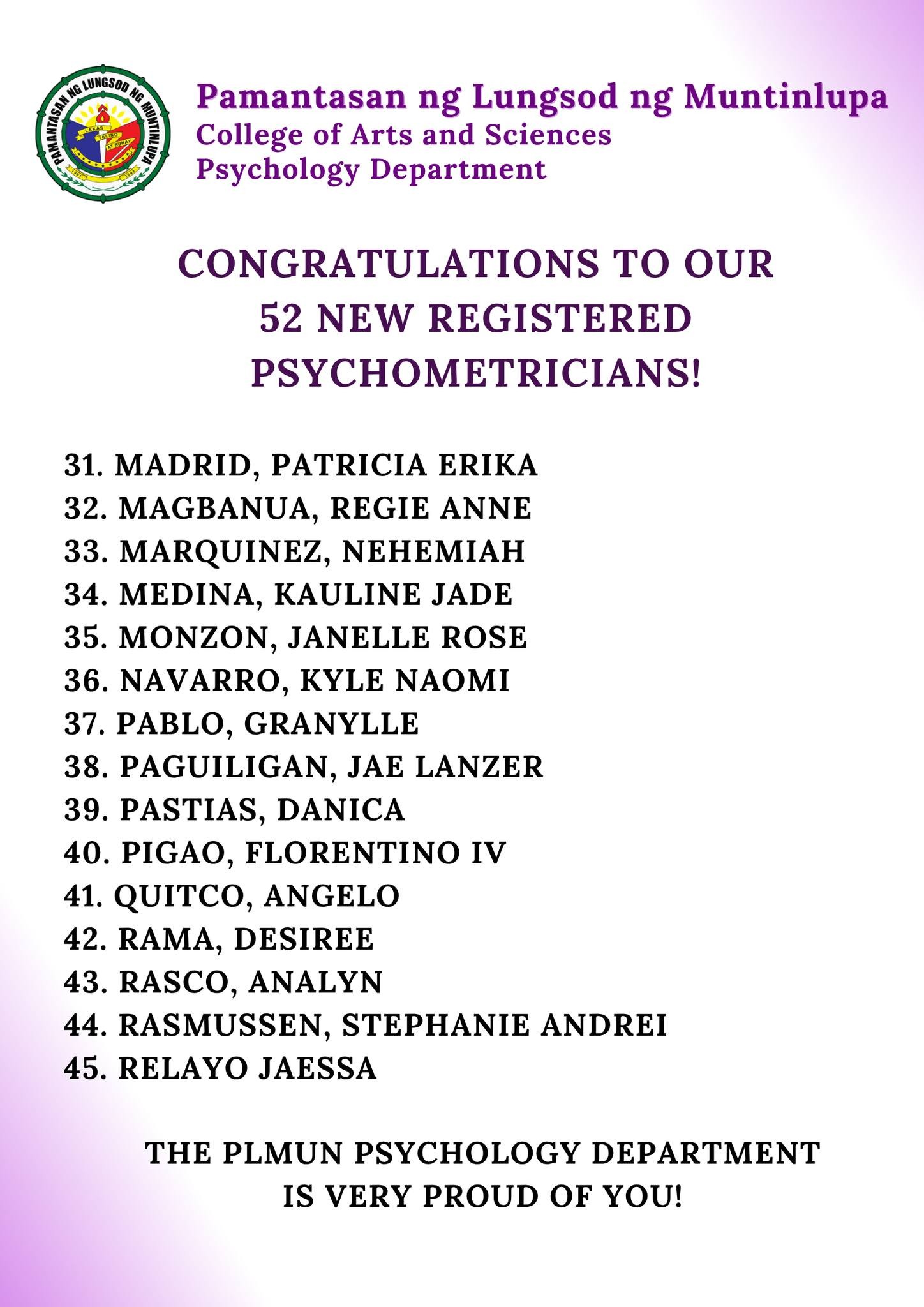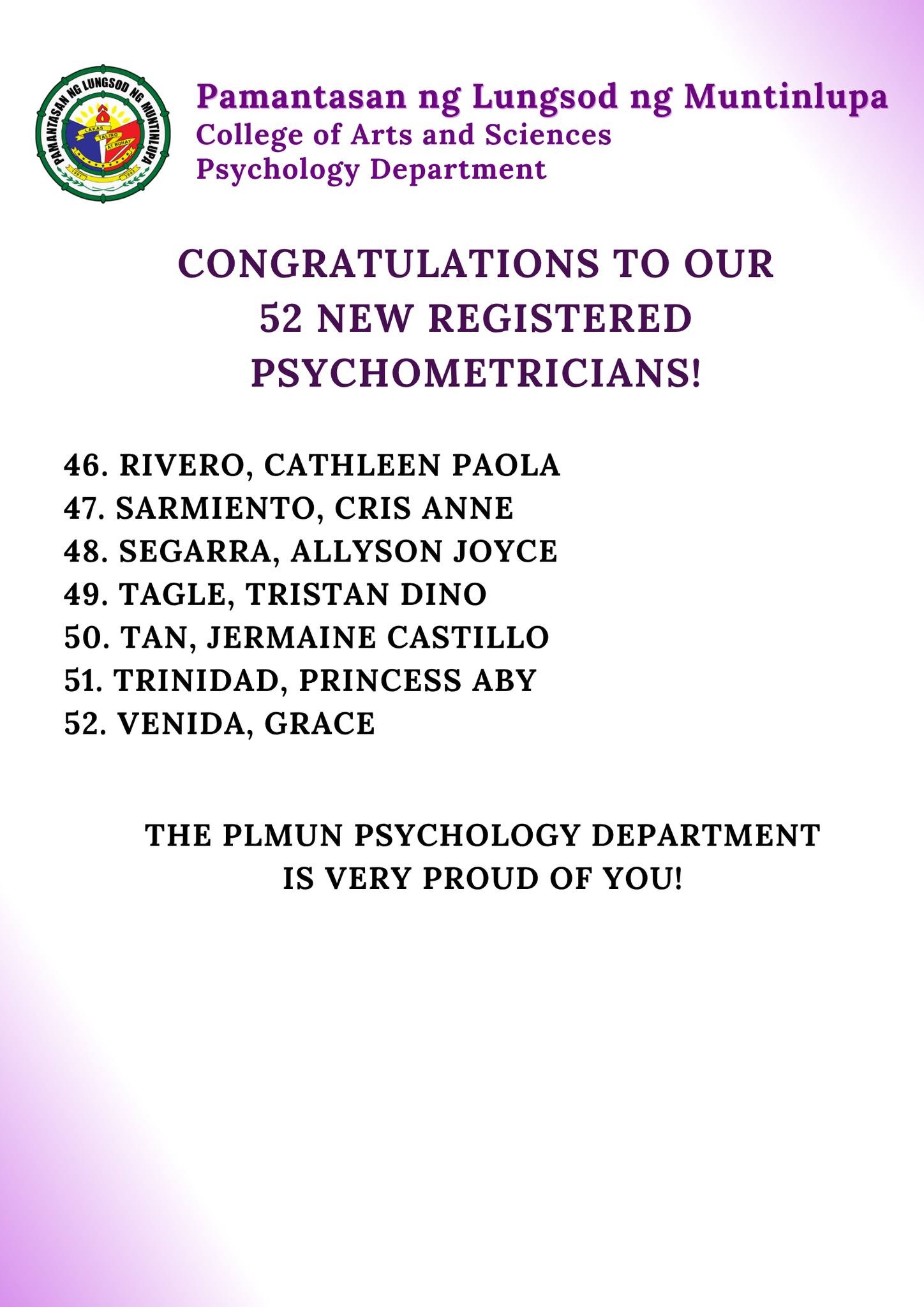 We proudly celebrate the 52 new Registered Psychometricians from Pamantasan ng Lungsod ng Muntinlupa!